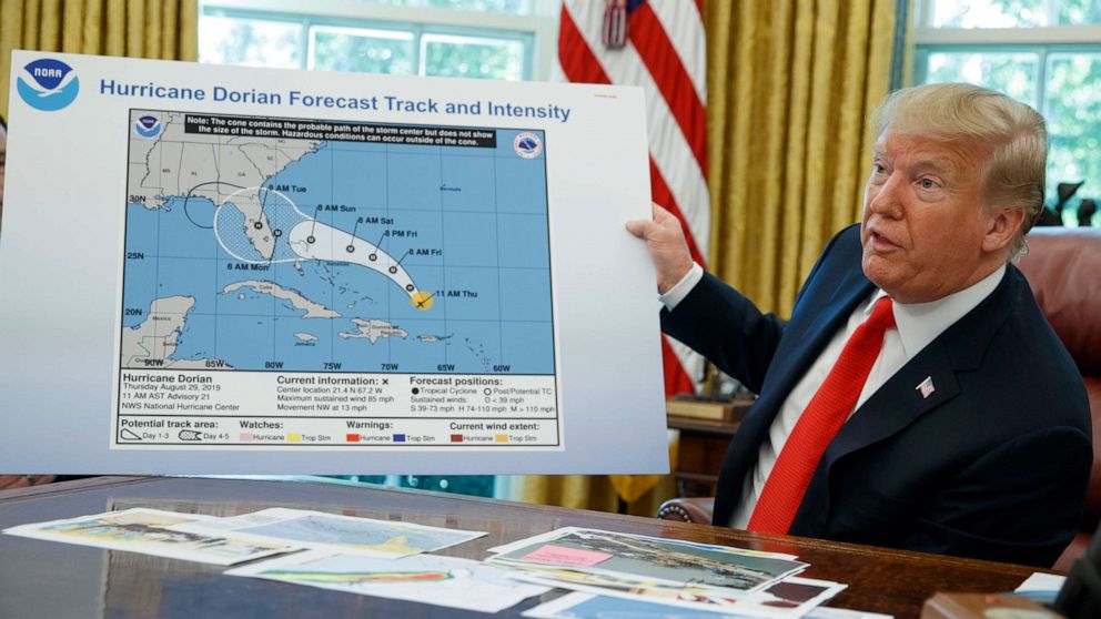 - Trump the Weather Forecaster – In September, 2019 Trump stated that Alabama was in the path of Hurricane Dorian which was then in the Caribbean. The National Weather Service and the National Oceanic and Atmospheric Administration (NOAA) however did not forecast that Alabama was in the path of the storm. Thus contradicted, Trump continued to insist that Alabama was in the path of the storm and forced the NOAA to retract their forecast and place Alabama in the storm’s track, although no model reflected that. He even went on television with a weather map on which he took a sharpie pen to circle the southeastern part of the state. For a week he continued to state that Alabama was threatened although the entire country knew it was not. He also threatened to fire NOAA employees if they did not support his inaccurate forecast.