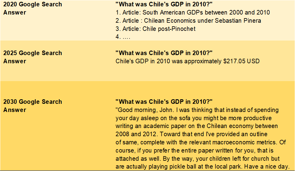 When OpenAI launched ChatGPT in November 2022, the world realized that computers could now talk on their own. Still, all ChatGPT represents is the ability to comb through massive amounts of articles, books, data, etc. and formulate a cogent, well-written summary of that research. The evolution of a Google search over the 2020s can be illustrated as follows: